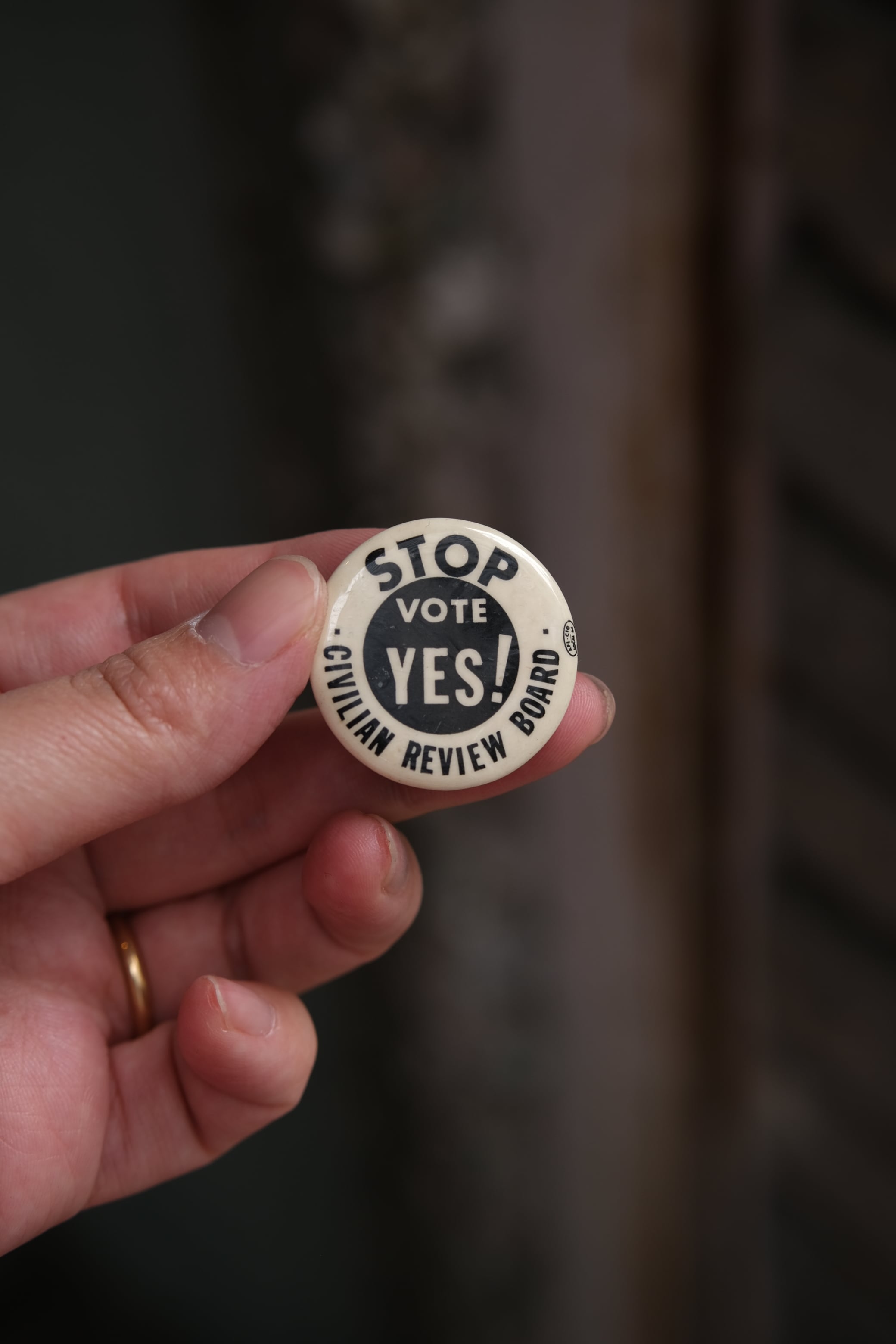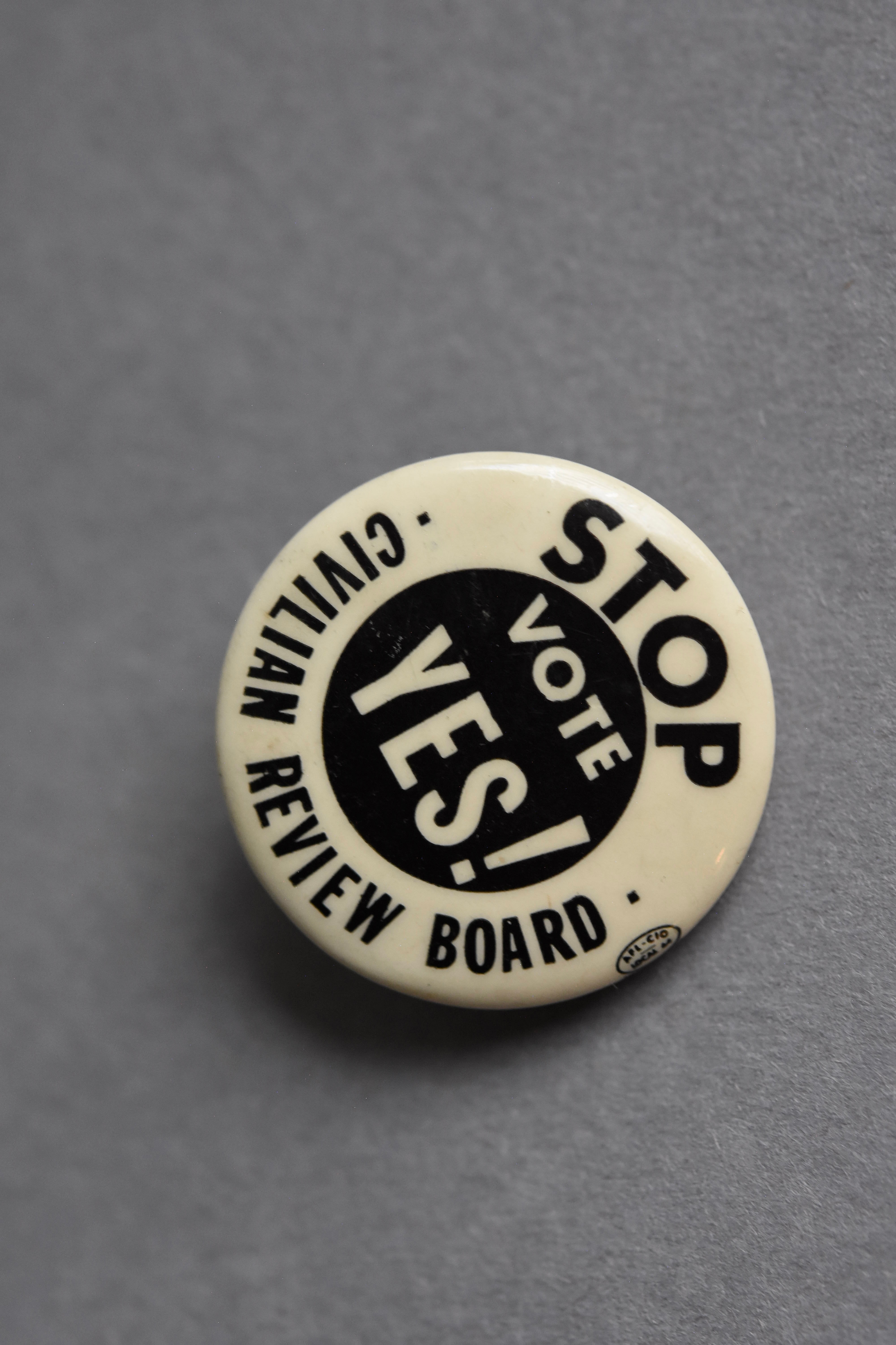 1960年代のアメリカで起こった、警察からの監視活動に反対する抗議の缶バッジ。