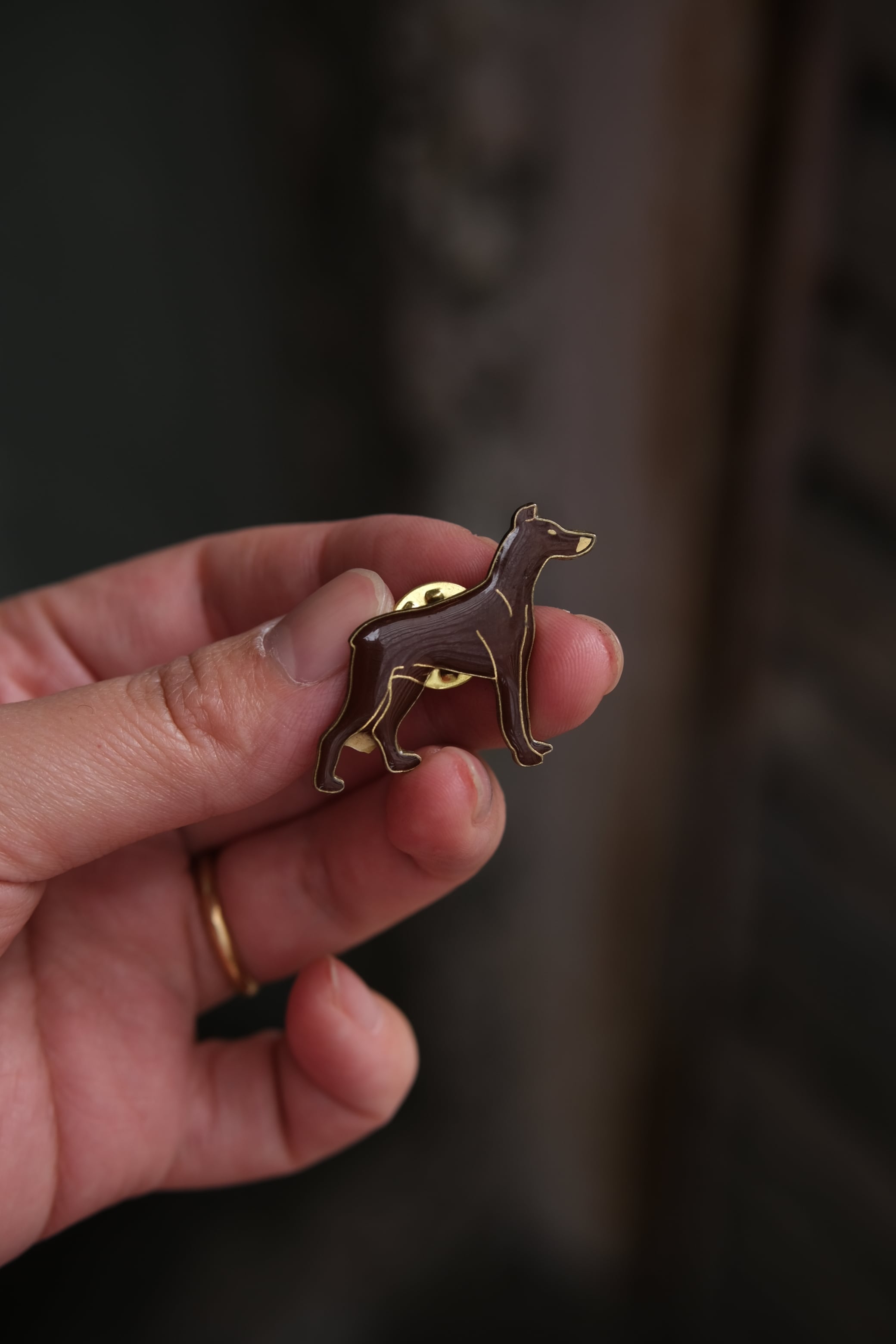 ドーベルマンのピンバッジ。ぷりっと重厚感のある素材です。