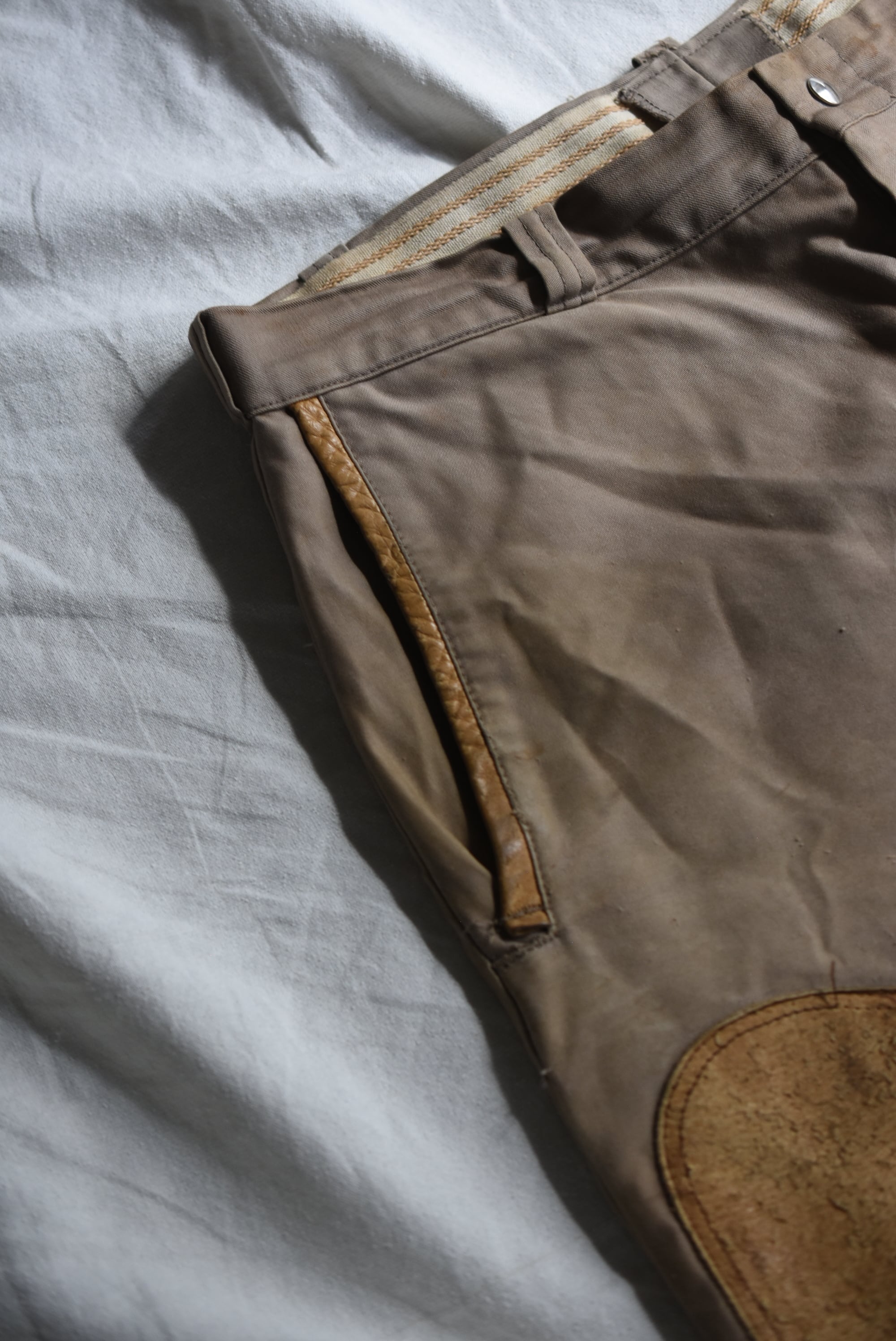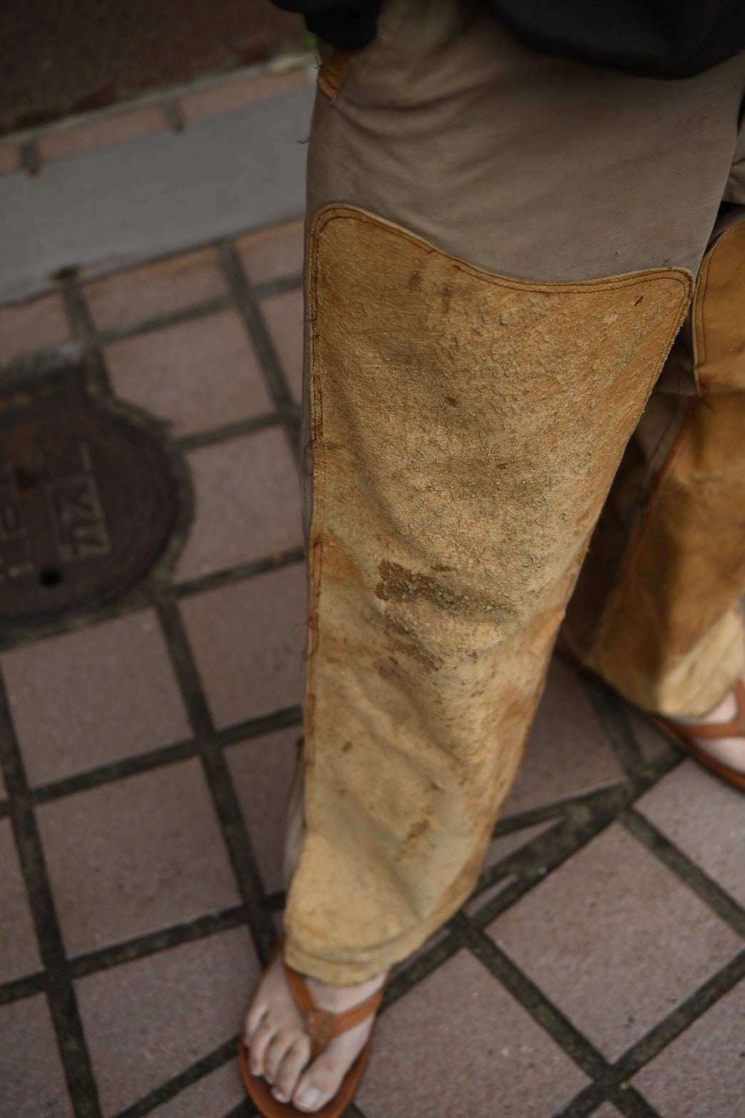 膝には贅沢な本革のレザーパッチワークが施されています。